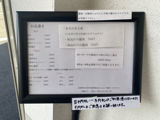 メニューを見て、あらかじめ決めたとおり、「特製醤油」(1,350円)と「特製白醤油」(1,350円)を購入。