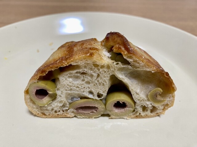 商品名がやたら長い「レスペクチュスパニスT-80 オリーブカンパーニュ」は、もちっとした素朴なカンパーニュにオリーブがゴロゴロ入ってる。