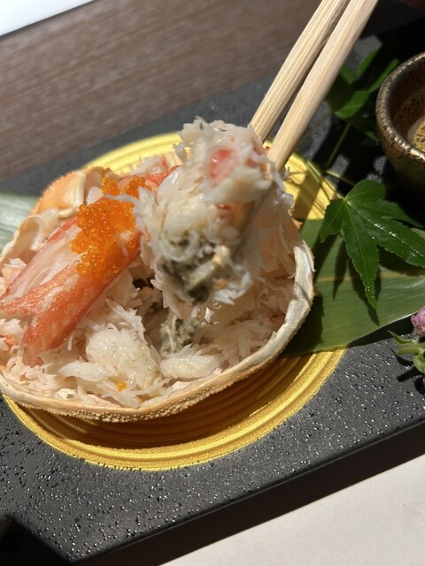 ここで、個人的なスターの登場です。ズワイガニの姿盛り!どーです。このビジュアル。うまいにきまっています。足と身の下には、もちろんミソがたくさん!!あやうく、舐めたくなりました!
