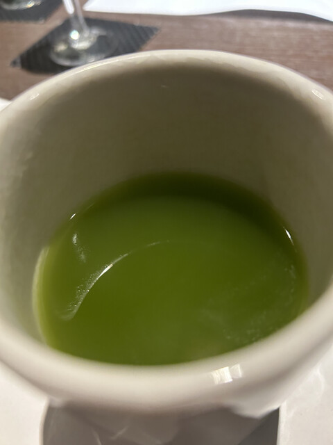 食後には、デザートで、もものゼリーとお茶です。あのねー、このお茶、おちゃがうまい。だってね、お寿司屋さんベースだから。。。お抹茶ですよ。