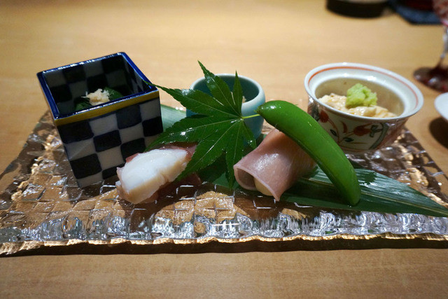 ■八寸 金時草、バイ貝、アジのなめろう、湯葉、等