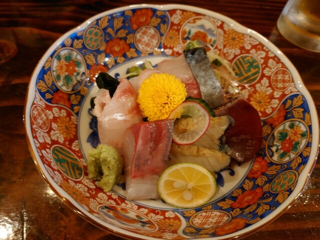 刺身盛りは、夜行貝やカンパチが入った値段の割にゴージャスな構成。