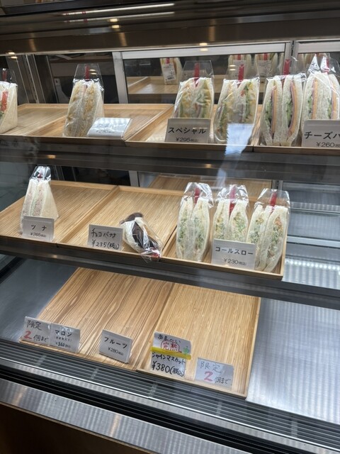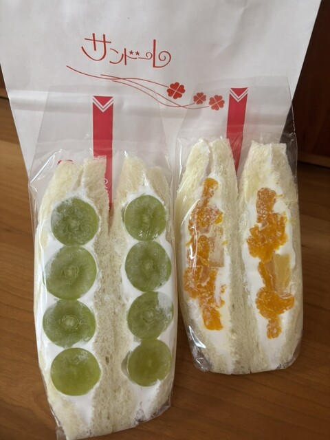 購入したのは季節のフルーツサンドシャインマスカット380円、フルーツサンド280円、たまごサンド230円。