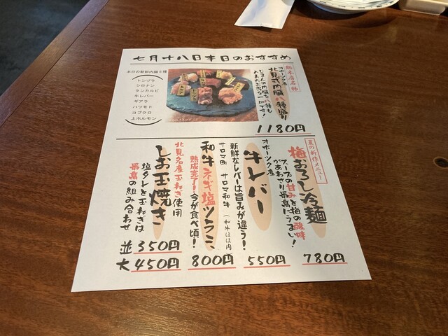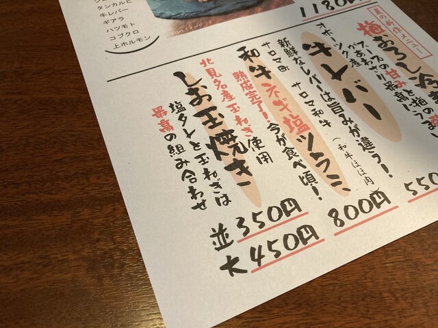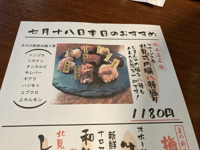 なにせ短時間一本勝負のため、選ぶ時間ももったいないため、ホルモンは北見式内臓8種盛り。野菜は北見の誇る「たまねぎ」で肉は徹底的にサガリ一本勝負です。他にもいろいろありますが、この3つ押さえておけば後悔は恐らくありませんww