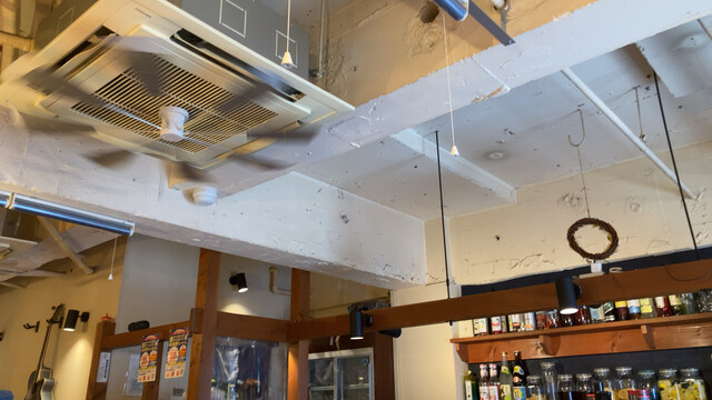 テーブルは4人卓、2人卓もろもろで5卓くらいあったかな。カウンター席も7席くらいありました。一人飲みにも良さそう。天井はコンクリート打ちっぱなし配管剥き出しのデザイン。テーブルセットは白木テイスト。
