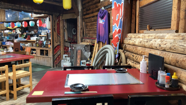 店内の雰囲気はエイジングされた番屋っぽい感じで煌々と明るくもせず若干の薄暗さを感じますが、これも演出と思えます。また店内は中央の本館的なスペースと線路際の別館的なスペースに分かれていますが、本館の方は生け簀に囲まれて水族館のようなスペースになっています。奥の別館は線路際で大漁旗が天井に張り巡らさせています。