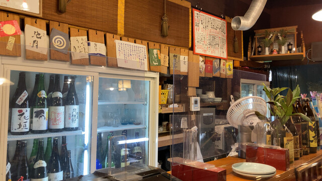 カウンターに座ると前には寿司屋さんみたいにネタケース。カウンターテーブルはいい感じに経年した板張りのテーブル。バックカウンターには神棚、日本酒冷蔵庫。