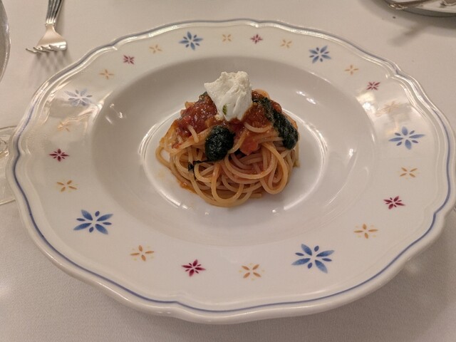 トマトソースのフェデリーニ バジルソースとリコッタチーズ添え