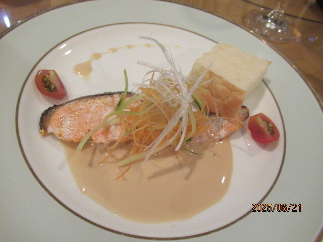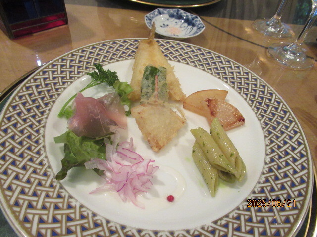夕食はフルコースのディナーで、魚のソースが絶品!そしてオーナー自ら、茨城の阿字ヶ浦で釣ってきた魚が前菜に・・・