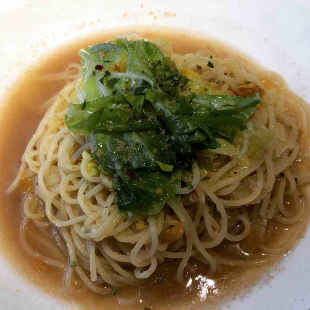 ここはペペロンチーノと思い、キャベツとアンチョビのペペロンチーノカラスミ風を頼みました。