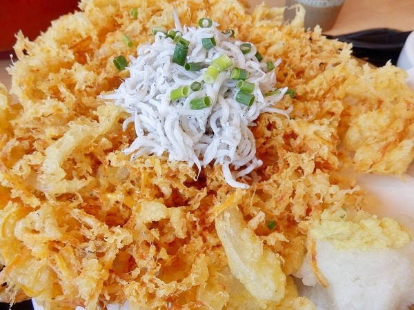 しらすのかき揚げの上には茹でしらすまで載っていて、まさにしらす尽くし、存分にしらす!