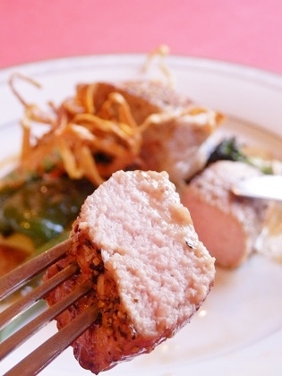 160℃のオーブンで焼いたあと表面にフライパンで焦げ目をつけたもので、カリリと香ばしく焼き上げられた皮と対照的に、中からはジューシーでほとばしる肉汁。
