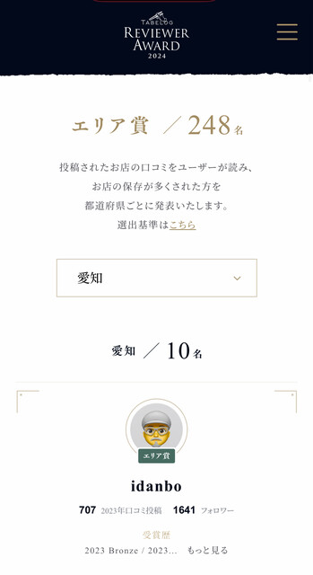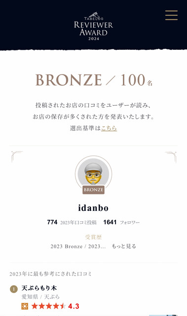 Tabelog Reviewer Award 2024 BRONZEを受賞しました (2024/01/18)