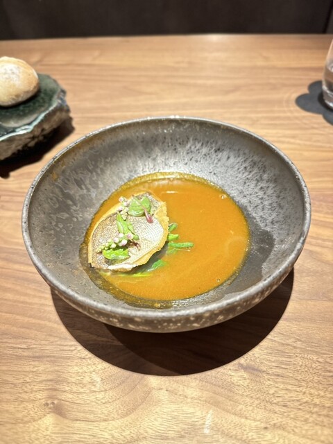 コチ、穴子、カサゴ、アカシャエビを使ったブイヤベースで、ポワレしたイサキが入っていて、サフラン風味ソースが加えられていた。