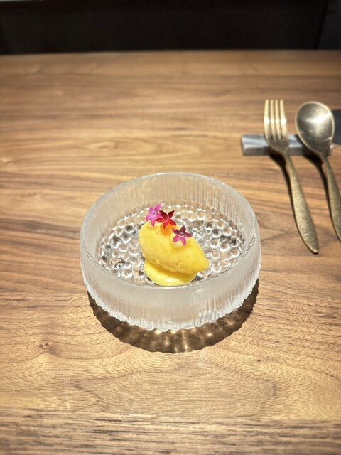 豊橋にあるマルカワ園芸が栽培し登録商標も持つ極上柑トロのお蜜柑「蜜ツ星プレミアム」を使ったソルベと、レモンのソース、丸ごとレモンをクラッシュしたソース、みかんをコンフィチュールにしたソースを添えたデザート。
