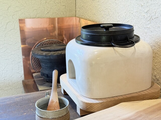 かまど炊きご飯は、盛岡 岩鋳の南部鐵器「ごはん鍋」を使った、土と漆喰の天然素材でハンドメイドの工芸品「おうちかまど」を使って炊いた自家製ササニシキのご飯。このご飯がとても美味しかった・
