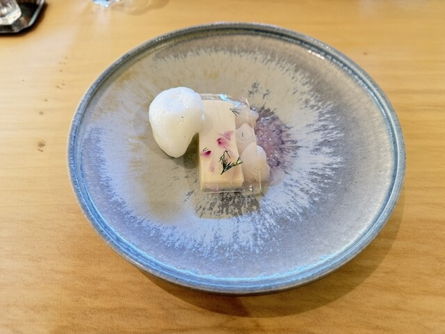 一品目は、外に見える藤の景色を食べるというコンセプトで、藤の花のシロップを使ったデザート。藤の花のゼリーとシロップ、野生杏仁の杏仁豆腐、ライチと酢橘のマリネ、藤の花のシロップで漬けたタピオカやナタデココ、野生杏仁の香りを移した豆乳泡がデコレーションされていた。