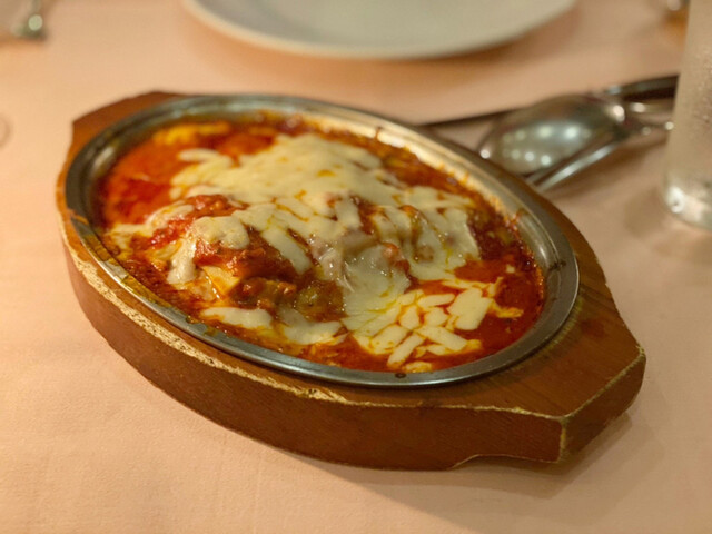 お目当てのラザーニアは、焼き立て熱々でやけどしそうなくらいです。「これが、日本で初めて食べられたラザーニアなんだなあ」と、日本のイタリアンの歴史を感じながらひと口。
