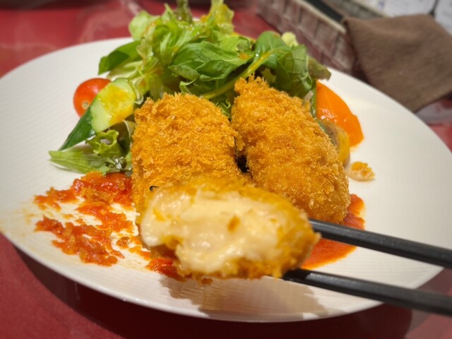 クリームコロッケは、ねっとり固めなクリームでした。トマトソースは、鮮度が高くて酸味が強く、さっぱりしています。