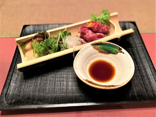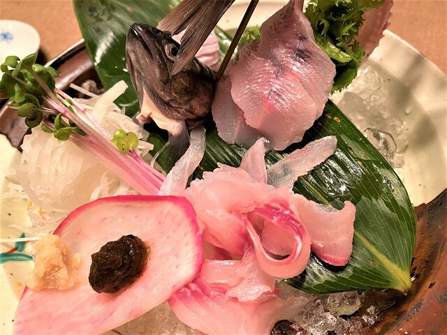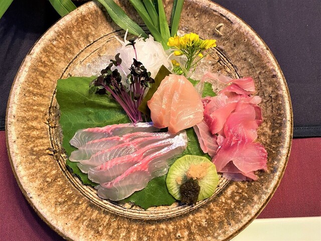 湯引きした岩魚などを、醤油、味噌と酢のタレ、ドレッシングでいただきます。