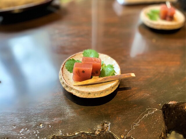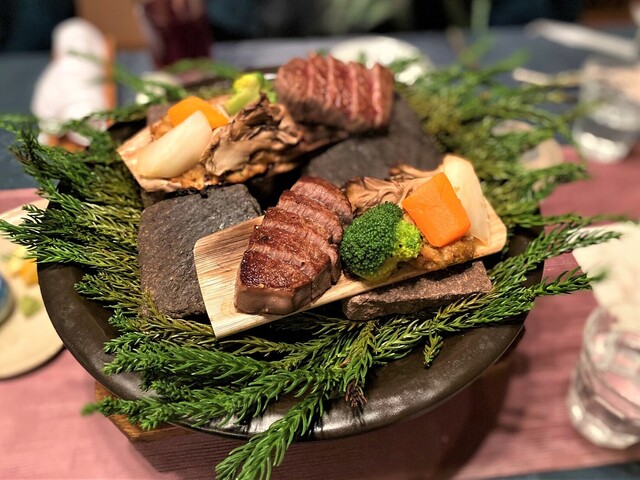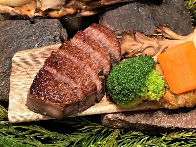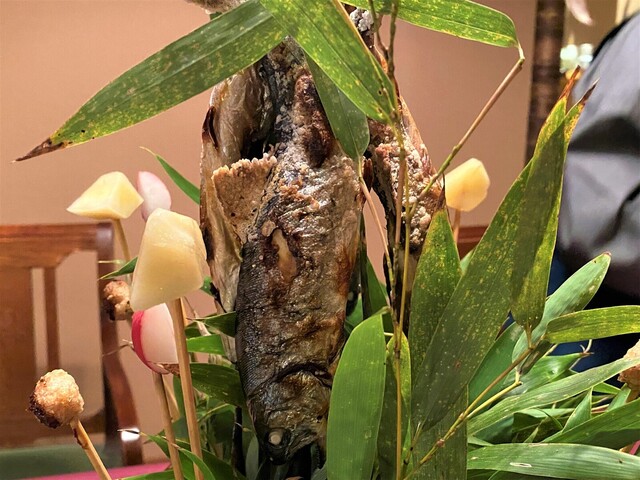 さきほどの岩魚の骨を煎餅にした料理の後、柔らかい食感の馬刺しのウニ巻きや、煮物とすりながし、さらにはコンソメ風の味付けの鯉のスープのあとが、岩魚の塩焼きと双璧の牛フィレです。