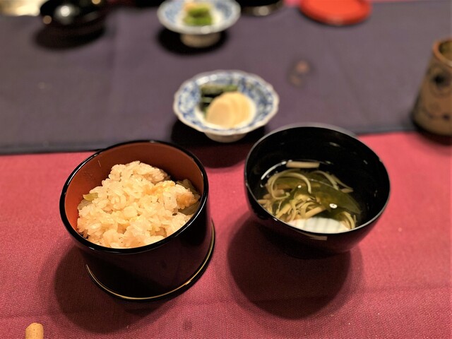野菜、魚、肉など一連のたっぷりの料理の後、振り返ってみると、〆のこのご飯は、大葉の香りと岩魚の風味がして、最高の極まりと思います。