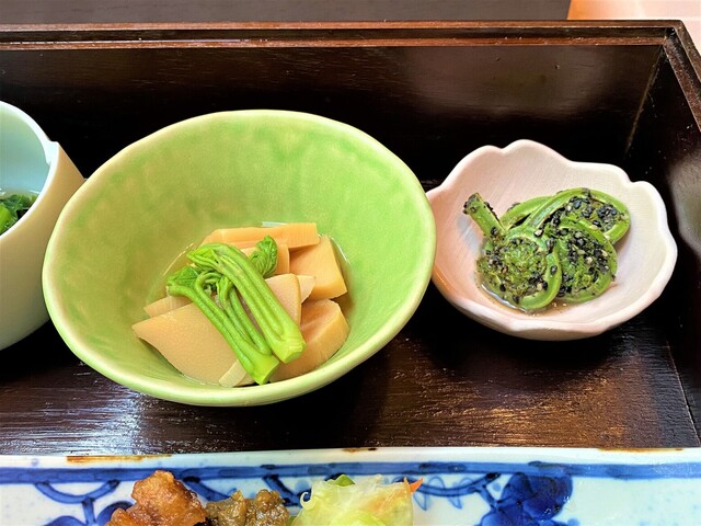 大きなお皿は、蕗味噌がのった粟麩や、よもぎ豆腐などで色鮮やかです。
