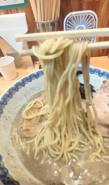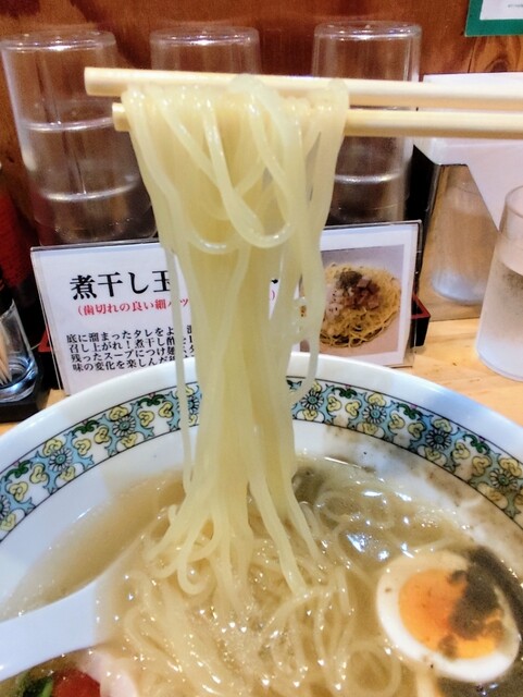 強い弾力性があり、なめらかな食感で喉ごしのいい細麺は、この煮干しスープにめっちゃ合う
