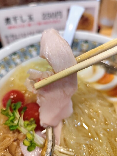 具材は、スライスゆで卵、鶏のムネ肉、プチトマトのマリネ、酢漬け煮干し、カイワレ、手仕事メンマといったラインナップで、どれもそれぞれの個性が感じられて手間が掛かってるな〜って感じ