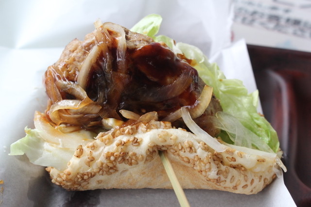米粉バンズと桃色吐息(姫路グルメポーク)パテと新鮮野菜の夢街道特製ハンバーガー。