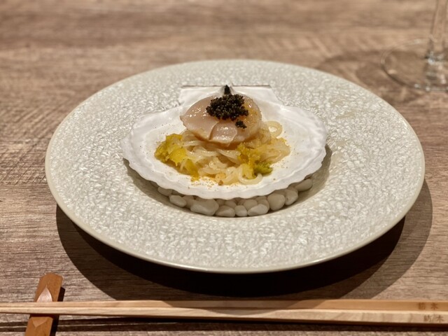 とんぶりとホタテ(超レアなあぶり)黄色の唐辛子で仕立てたキムチを添えて。麺は自家製。