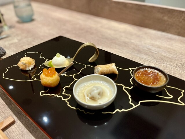 さて前菜は東北が描かれた漆塗りに佇む6品から。