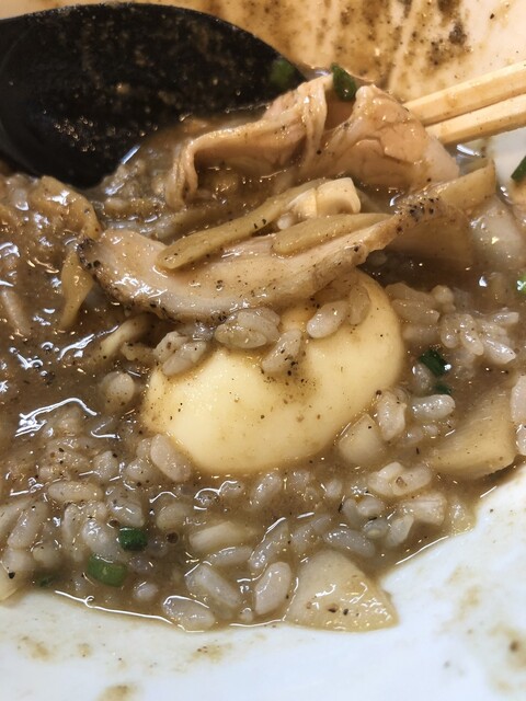 食券を渡して、待つこと5分ぐらいでしょうか。待ってましたの「まぜそば」が!いやー、美味しそうです。まずは、まぜまぜして汁と麵が絡むようにしてから、麺を一口。いやー、これは抜群に旨いですよ。本当に。久しぶりに高得点なラーメン屋さんに出会えましたね。やはり、埼玉県内トップクラスの四つ葉と名前が兄弟姉妹みたいな関係なのかもしれませんが、奈良県でトップクラスなんじゃないでしょうかね。そして、前日食べた麵屋Kもそうだったのですが、天下一品的な食べた後に味が残る濃さがあるんですよね。これは奈良県独特なのかな。。いずれにしてもあっという間に食べてしまって、その後に、追い飯を追加してもらいました。追い飯っていうのは実は初めて。あー、こういう食べ方もありかなって。まぜまぜして、おじやみたいになりましたが、これも旨い。同僚はしょうゆラーメンにしていましたが、旨いって言っていました。お互いに満足して、お店を出たところ、かなりの行列。やはり11時半に行っておいて正解でした。また、奈良県にくることがあれば絶対に寄りたいお店ですね。ご馳走様でした。