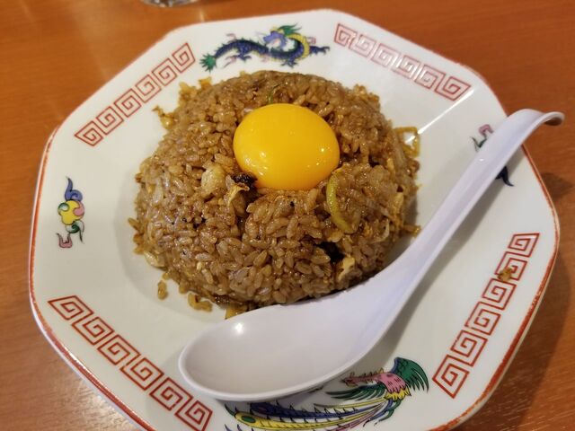 醤油由来のやきめしは、ベチャっとしているが、パラパラ感は皆無であるが、これはこれで旨い。玉子、ネギ、チャーシューが入っている。途中で黄身を崩して、味変。量は通常の半量で、麺と食べると適量。