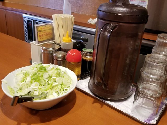 の食券を購入。卓上には、ネギが入った丼が置いてある。