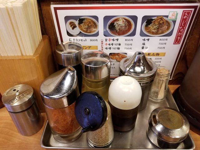 しまうので、卓上のニンニク、一味唐辛子を投入して濃さを強化。