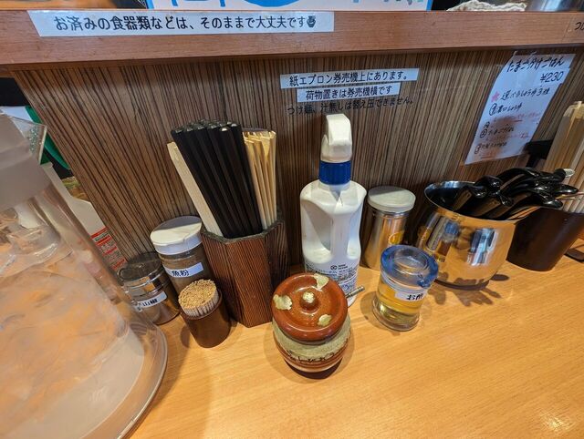 席はカウンターとテーブルがあり、テーブル席に着席。紙エプロン完備。水はセルフサービス。