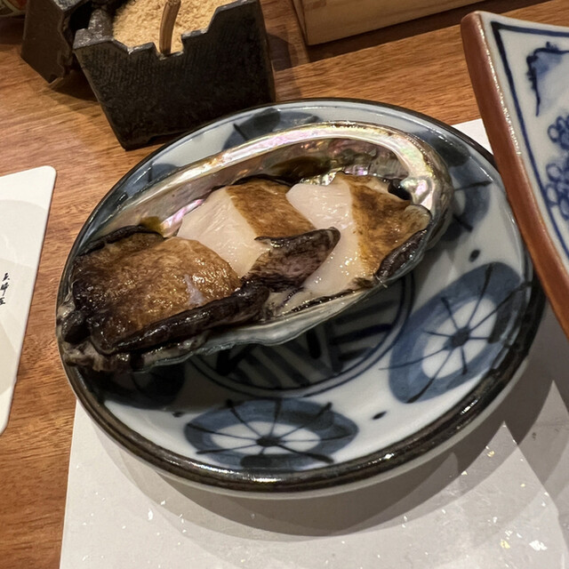 ホタテの貝柱を贅沢に海苔につつんでいただく。