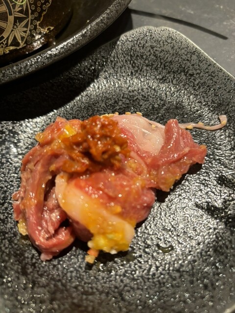 合法ユッケと色々なトッピングを巻いて食べているんだけど、アクセントにチャンジャでアクセント