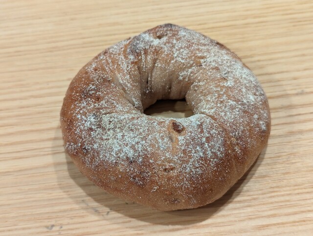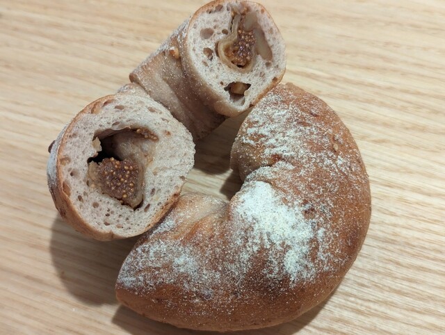 とてもジューシーな無花果です。大粒ですね。白ワイン漬けされていて、風味が引き立ちます。比較的シンプルながら無花果の粒粒感だったり、胡桃のコリコリとした食感が際立ちます。こちらも粉が振ってあるので、よりカリッとサクッと感を感じるベーグルとなっています。