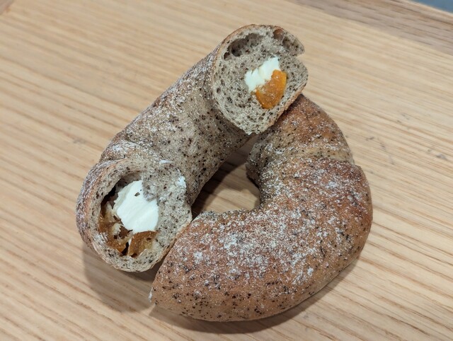 ライ麦入りのカンパーニュベーグルサンドです。香ばしく、むぎゅっと詰まった感のある食感。歯切れ良いです。ピリッとペッパー効いたローストポークがふわっとした食感、そして口の中で蕩けていきます。発酵バターとクリームチーズの甘み旨味が加わります。2人でシェアしていただきました。胡桃入りの生地も風味が濃く、フィリングの味わい共に噛みしめるごとに深みが増します。