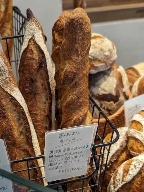 形状はフランスパンです。こちらのお店は食感の違いを楽しめると思いました。リベイクしていただきました。磯の香りが濃いです。しっかりハード系で厚めのクラストは「ガリ」「ゴリ」食感です、クラムはもっちりしています。クラムは弾力があり、粘り気も感じる。濃いめの焼きめで表面は硬め。だけれども成形でねじりがあり、食べやすくなっていると思う。フランスパン自体が塩気もあるので「あおさ」単体でも美味しいと思うけれど、生ハムの旨味をあおさの生地にも染み出ている感じが何とも言えない。噛みしめるごとに旨味の相乗効果。