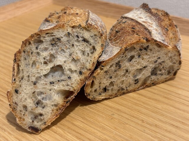 黒胡麻入りのプチサイズのバゲットです。リベイクしていただきました。少し引きがあり、クラストはザクザク食感です。硬めですが、弾力があります。小麦の風味が良い。さらに黒胡麻が加わることで、より風味が増しています。コクというのか、旨みが濃いバゲットでした。