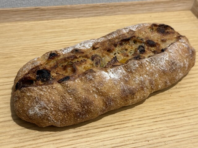 生地硬め。アプリコットの洋酒漬けの洋酒が効いてる。ほわッと感がある。レーズン、ホワイトチョコ、ピスタチオなども。甘み、ほろ苦さ、ナッティーさ、フルーティーさ。立体的な味わい。