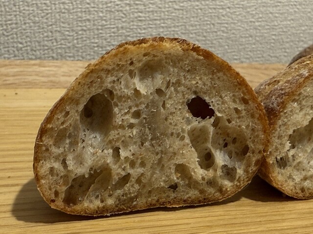 焼きめしっかり、クラスト厚め。ザクッともっちり食感。クラムは餅のような粘り気ある。甘み感じる。仄かな酸味。