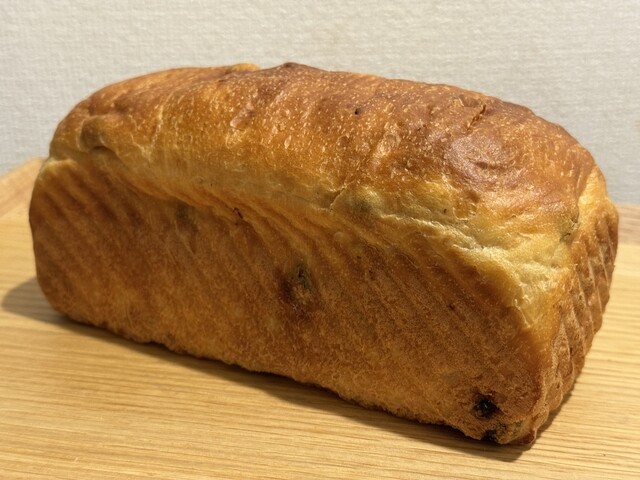 山中牛乳使用。クラストはザクザク食感。クラムは高加水、スポンジのように柔らかい。そしてキメが細かい。トースターで温めるとそれなりに色づく(砂糖もそれなりに使用されていると思う)けれど、砂糖の甘さよりも乳の味が強い。ジューシーなレーズンは甘く、酸味はない。クラスト(耳)がお菓子のような味わい。