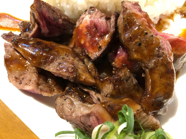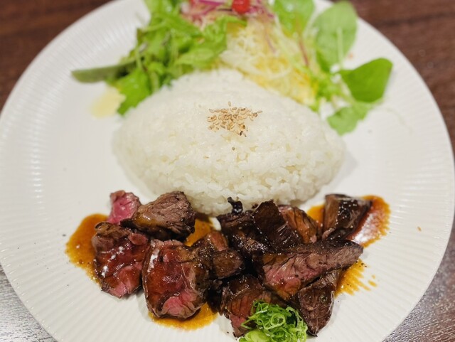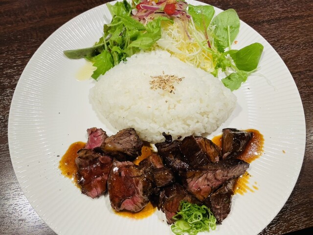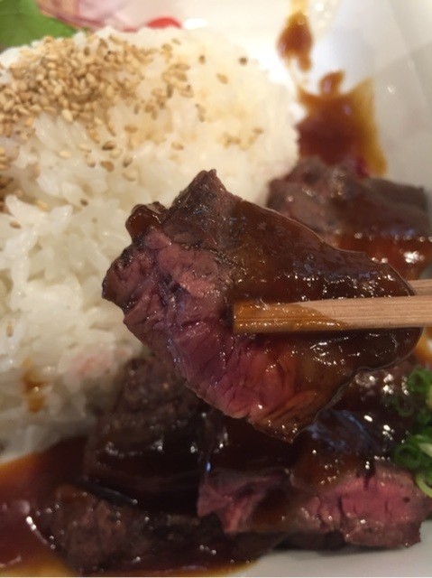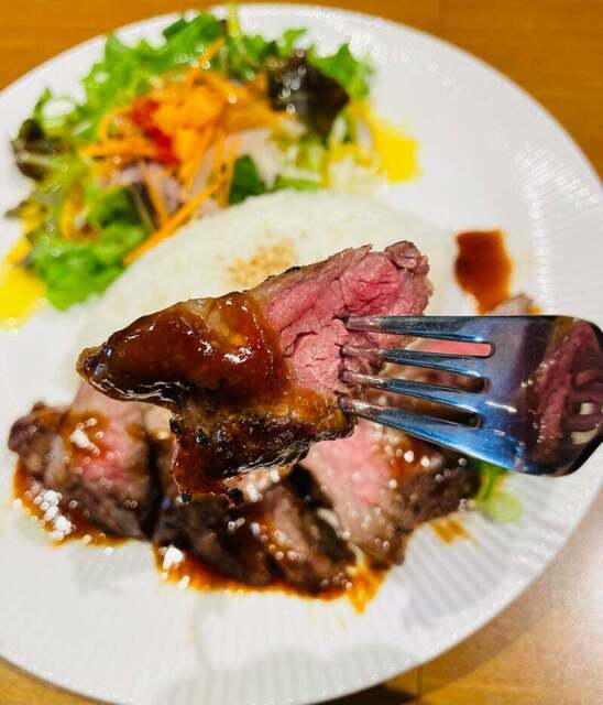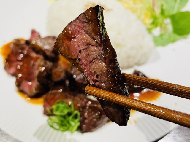 特製ソースがしっかりとした旨味を持つ牛ステーキを引き立てます◎