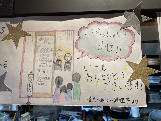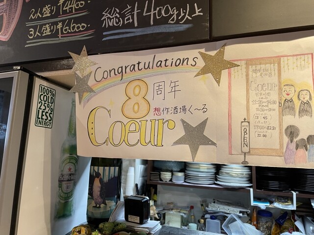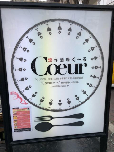 “心(こころ)・感情”に関する言葉の、フランス語の表現coeur(クール)!想作酒場くーるには、たっぷりのcoeurが♪料理は、神戸有名レストランなどで修業をしてきたオーナーが「リーズナブルに本格の❝料理❞と❝お酒❞を楽しんでほしい!!」との想いを胸に神戸初とも言える、お客様自身が具材を選べるアヒージョは名物!!ワインに関しても、オーナーが「ソムリエになる勉強に、ワインバーに行ってもやはり高額になりがち!それなら俺が安く色々飲めて、料理とのマリアージュを楽しんでもらえる店を作る!!」とのコンセプトもあり色々な想いが詰まったお店になっています。