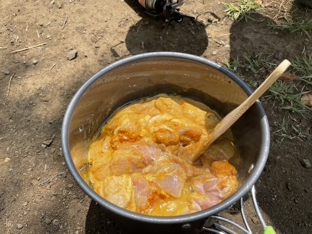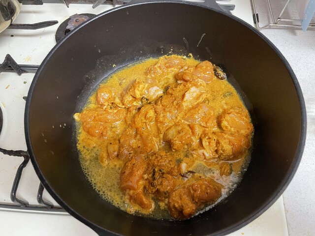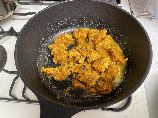 鶏肉と香辛料とヨーグルトでよく揉み込んで炒めます