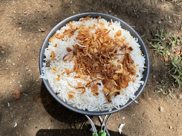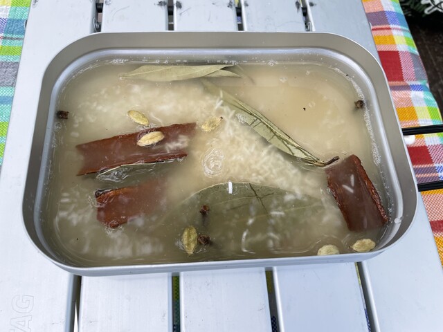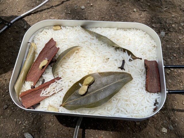 香辛料と一緒にバスマティ米をメスティンで炊きます